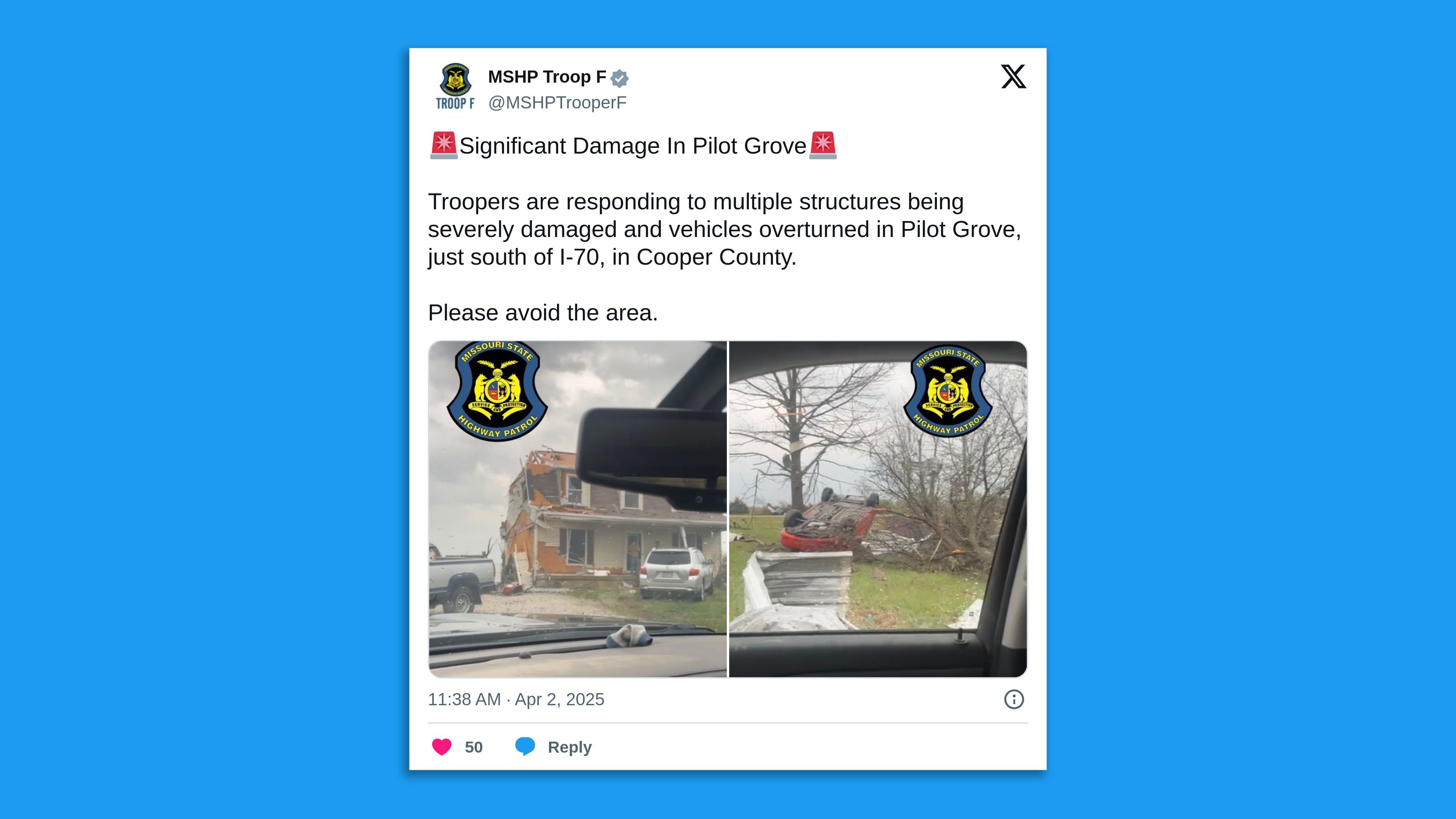 The scene in Missouri, where at least one storm-related death has been reported. Whitewater Fire Protection District chief Garry Moore died after responding to a presumed tornado, per a Facebook post from the fire department. “Chief Moore observed a vehicle off the roadway and stopped to assess the incident and render aid if needed,” the post says. “A short time later, Chief Moore was found unconscious at the scene.” Screenshot: Missouri State Highway Patrol Troop F/X