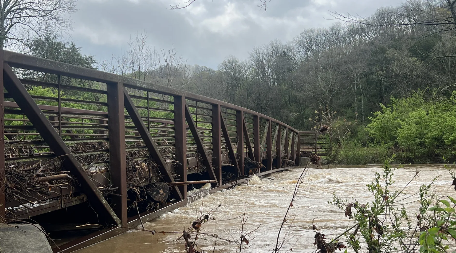 Floodwater from Whites Creek carries debris over a pedestrian bridge on the Fontanel greenway in Nashville, Tenn., where Axios Nashville reports flooding rains have inundated the city, resulting in temporary road closures.