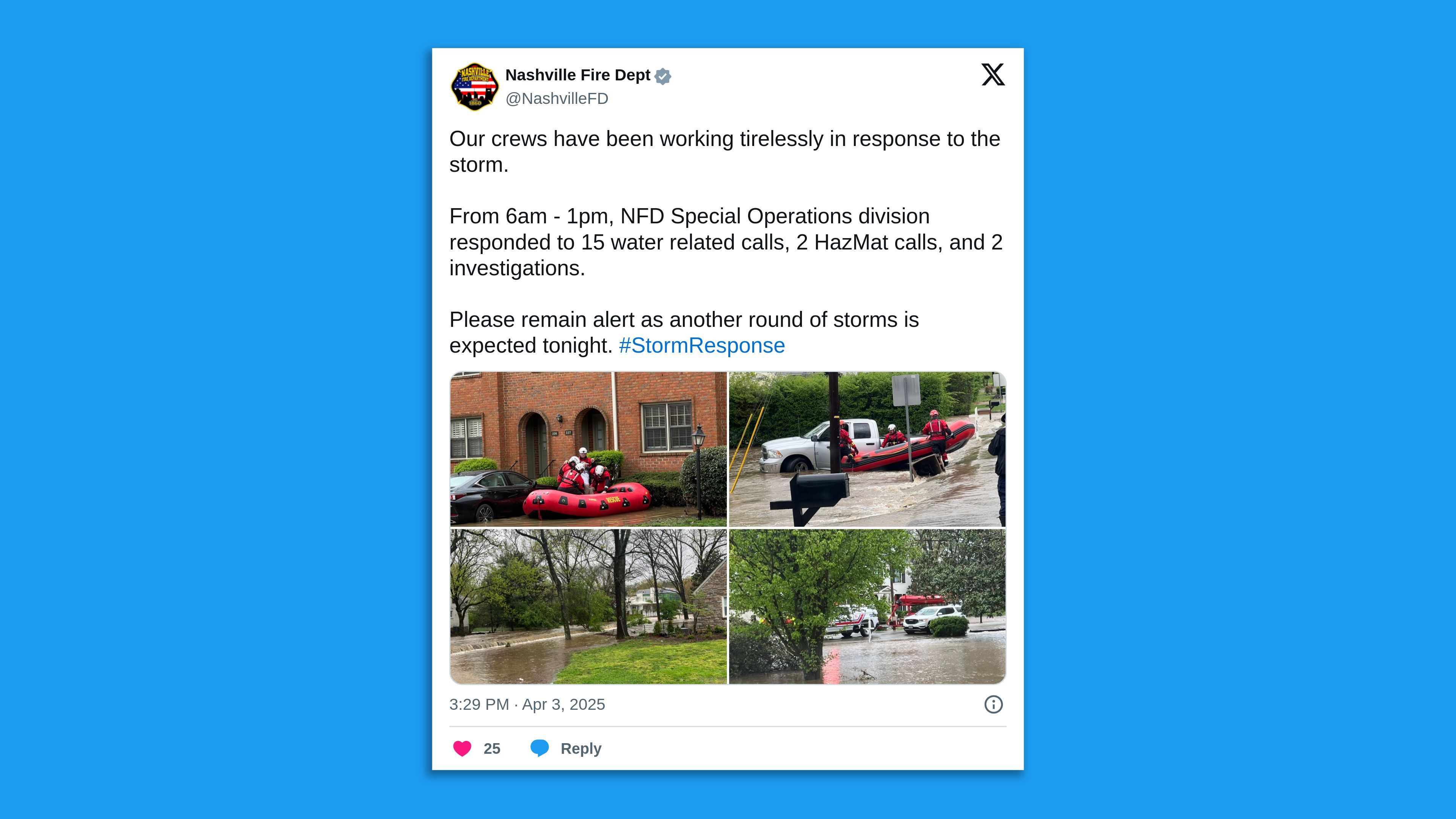Parts, Tennessee, Kentucky and Arkansas were the most at risk for possibly widespread life-threatening flash flooding on the night of April 3 before the High Risk area shifts west slightly the following day. Screenshot: Nashville Fire Department, Tenn./ X